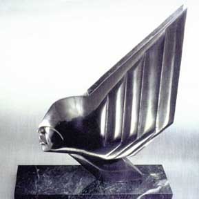 The Art Deco style head on the left was cast in 356 aluminum from a wood and plaster pattern provided by artist Lee Duran.