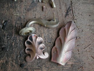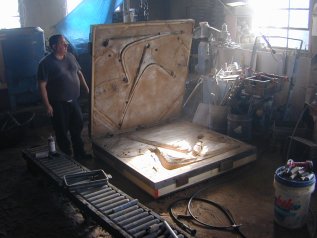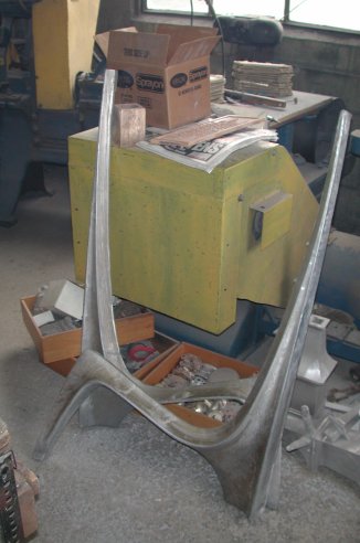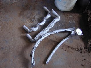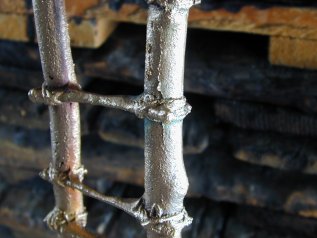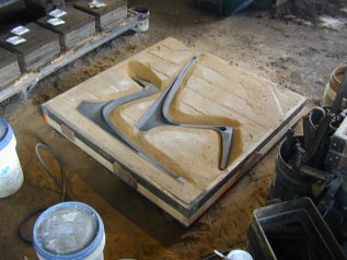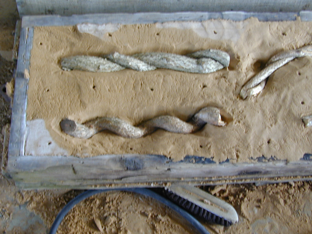 This is an example - before finishing - of the level of detail we can capture using natural materials for patterns . We cast this chair-back for a custom furniture designer. It is shown here just pulled from the sand and not yet cleaned-up . It was made from branches and twigs lashed together with string.