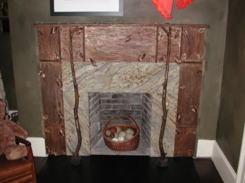Nine woodgrained bronze panels and the mantlepiece were produced from sandblasted wood patterns. The mantle support branches were cast from tree limbs. The decorative leaves covering attachment fastener sites were cast from patterns made by dipping sedum leaves in epoxy to increase their thickness.